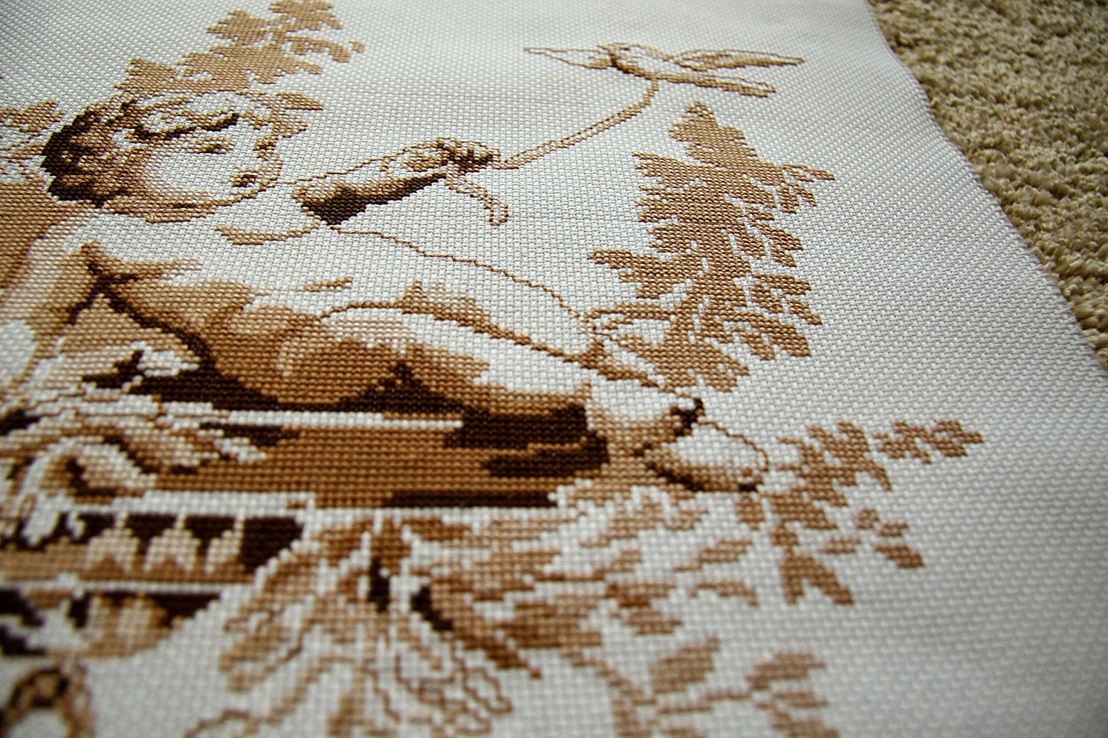 Udało się! Zakończyłam hafcik aniołka lub amorka. Praca nad nim trwała długo, bo wielokrotnie po prostu leżał i czekał na swój czas. Mobilizacja nastąpiła w związku z yarn meetingiem organizowanym przez Weronikę.