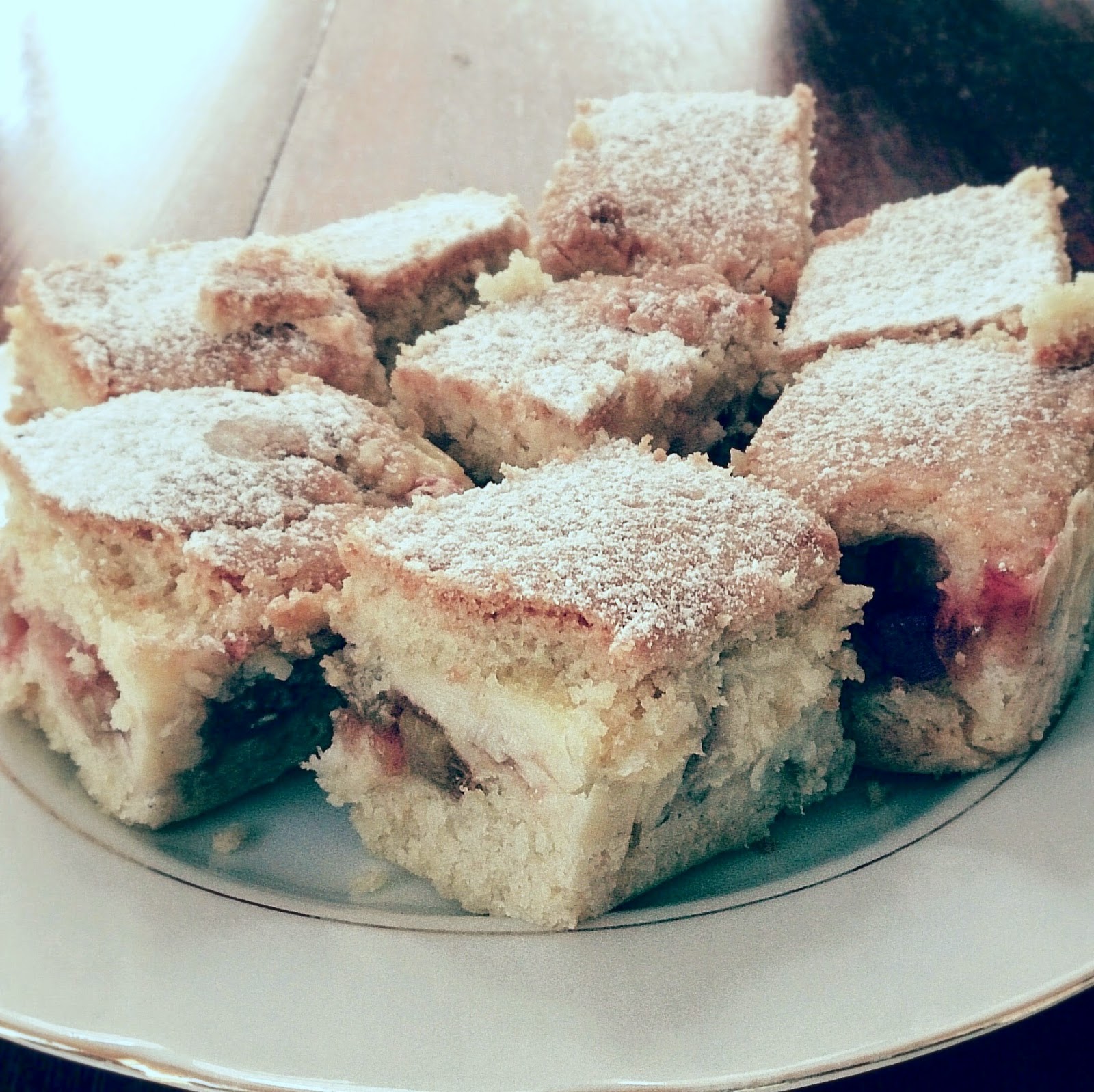 Właściwie nie chciało mi się nic robić, bo tak gorąco. Ale potrzeba zjedzenia czegoś słodkiego była silniejsza... i tak właśnie zdecydowałam się na ciasto z rabarbarem. Mięciutkie i zrównoważone - słodko - kwaśne. Takie w sam raz na podwieczorek :)